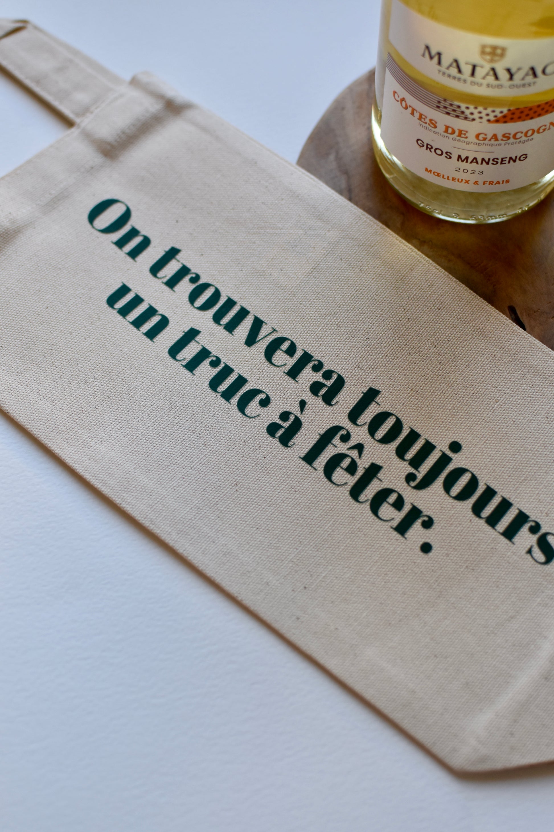 Fini le cabas en plastique de supermarché pour aller aller dîner entre amis ! Nos tote bags en coton et sacs à bouteille ont du style, du charme… et un brin d’humour. Avec leurs petites phrases bien senties, ils annoncent la couleur dès l’entrée.